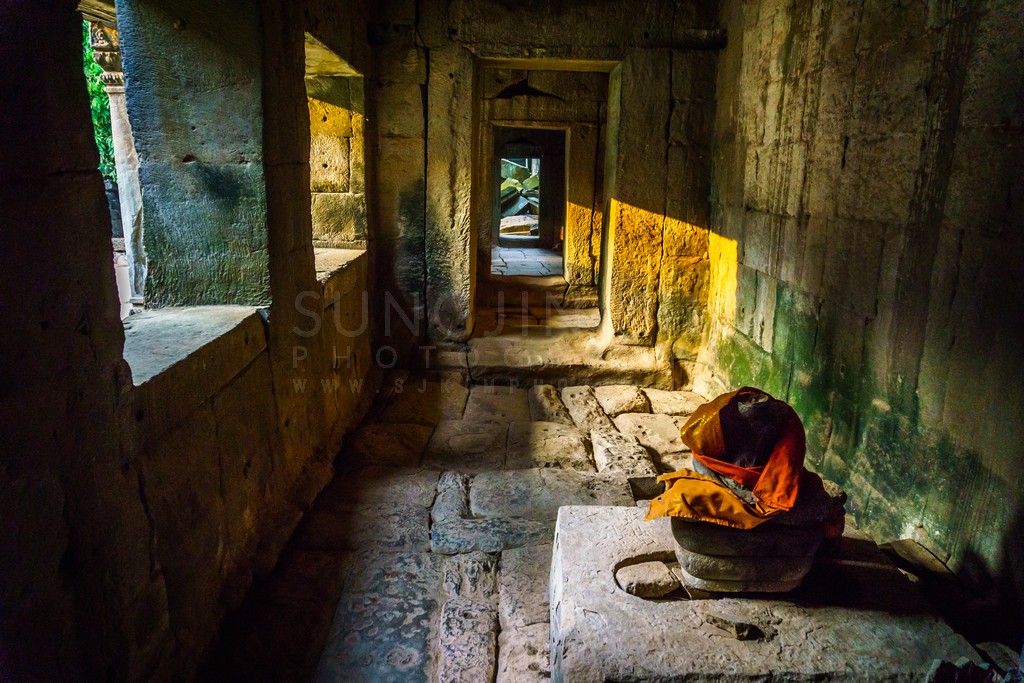 This photograph captures the mystical atmosphere of an ancient temple corridor. Sunlight streams through doorways and windows, illuminating sections of the worn stone floor and walls while leaving other areas shrouded in darkness. A draped statue sits on a pedestal, adding a touch of vibrant orange against the muted stone tones. The interplay of light and shadow creates a sense of depth and mystery, inviting viewers to explore the temple's secrets.