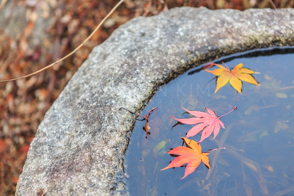 Three vibrant maple leaves float in a stone basin, their fiery hues of orange and red contrasting with the cool grey of the stone and the dark water. The shallow depth of field keeps the focus on the leaves, creating a sense of quiet contemplation. The soft, diffused light enhances the delicate textures and veins of the leaves, while the surrounding blurred autumnal background adds a touch of seasonal charm. This image captures the ephemeral beauty of autumn, a moment of transition and reflection.