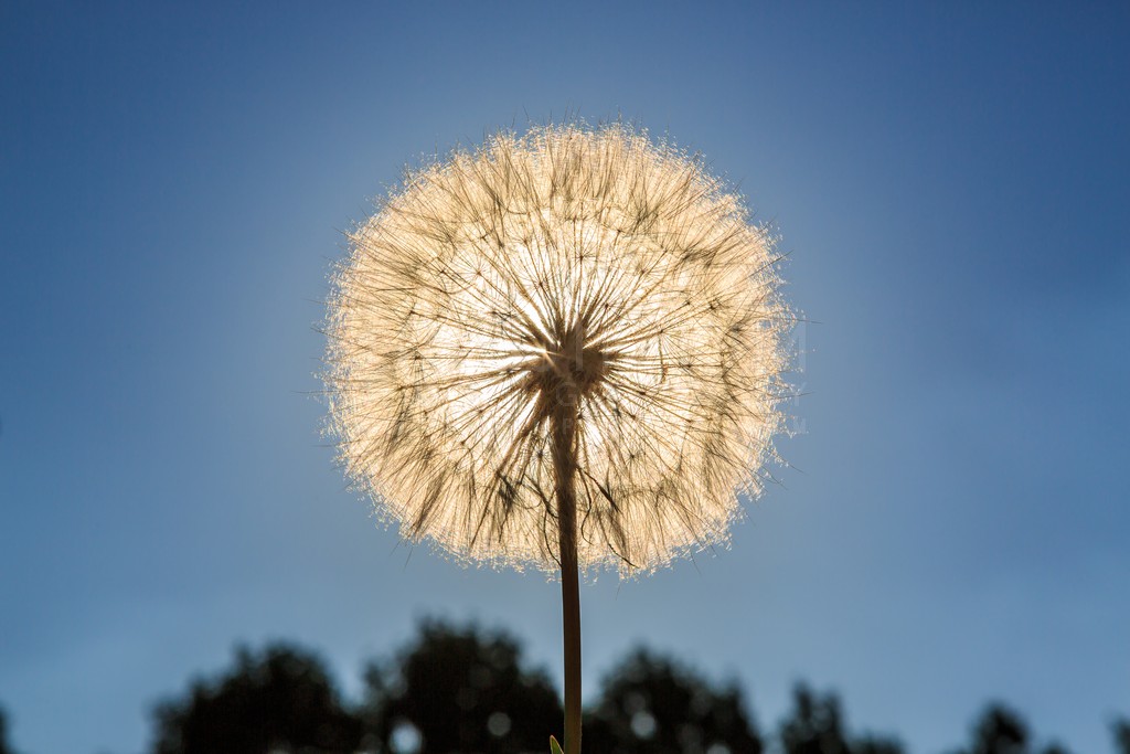 This captivating image showcases a delicate seedhead, possibly a dandelion or salsify, backlit by the brilliant sun against a vivid blue sky. The intricate structure of the seedhead is revealed in stunning detail, with the light creating a mesmerizing halo effect. The stark contrast between the ethereal seedhead and the clear sky evokes a sense of tranquility and wonder. The composition is simple yet powerful, drawing the viewer's eye to the delicate beauty of nature.