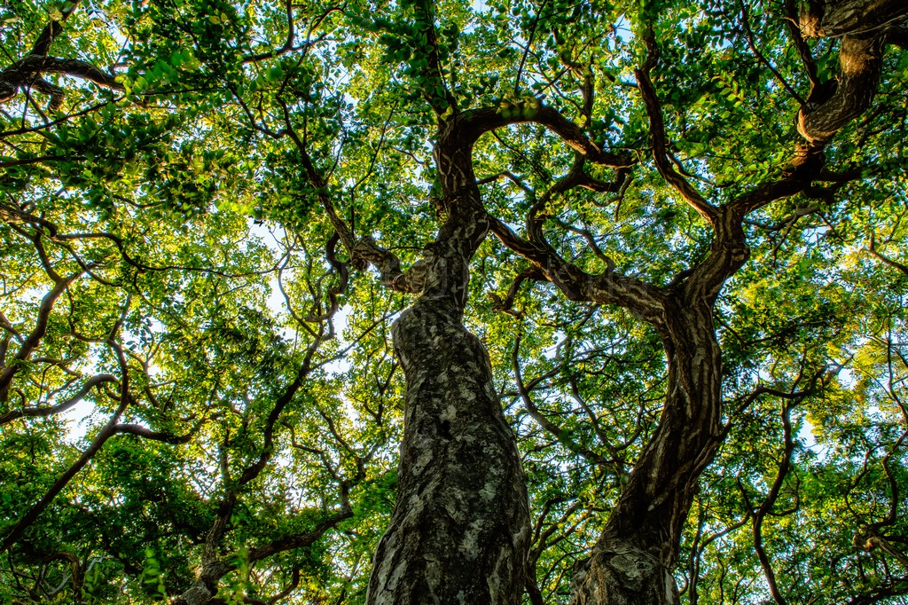 Shot from below, this image showcases the intricate network of branches reaching towards the sky. The gnarled and twisted trunks of the trees create a sense of age and resilience, while the vibrant green leaves filter the sunlight. The composition emphasizes the height and complexity of the canopy, drawing the viewer's eye upwards. The natural light creates a dappled effect on the leaves, adding depth and texture to the scene. The overall mood is one of tranquility and awe, inviting contemplation of the beauty and power of nature.