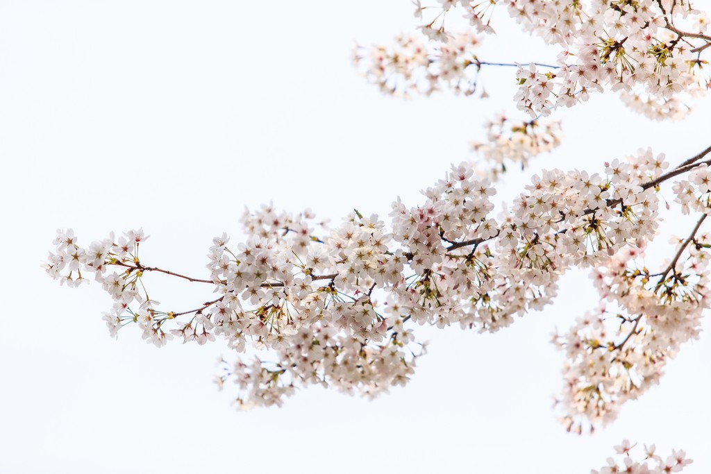 Delicate cherry blossoms grace the branches against a soft, bright sky. The image captures the ephemeral beauty of spring, with clusters of white and pale pink flowers creating a sense of tranquility. Soft, diffused lighting enhances the delicate textures and colors of the blossoms. The composition focuses on the intricate details of the flowers, creating a serene and captivating scene.