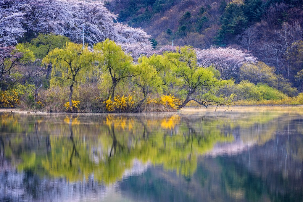 Vibrant spring colors of cherry blossoms, weeping willows, and forsythia illuminate the shoreline and reflect serenely in the still waters. The soft, diffused light enhances the textures and hues of the foliage, creating a harmonious blend of greens, yellows, and pinks. The mirrored image on the lake's surface adds a sense of tranquility and balance to the composition, capturing the essence of a peaceful spring morning. The stillness of the water emphasizes the delicate details of the reflected scene, showcasing the beauty of nature's mirror.