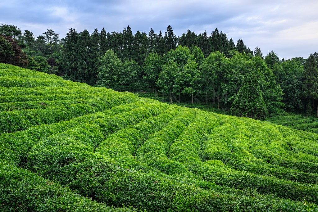 This image captures the vibrant green of a meticulously cultivated tea plantation. The rolling hills, covered in perfectly pruned tea bushes, create a mesmerizing pattern. The soft, diffused light enhances the rich hues of the leaves and casts subtle shadows, adding depth to the scene. A backdrop of trees provides a natural frame and adds a sense of tranquility to the composition. This photograph evokes a feeling of peacefulness and showcases the beauty of agricultural landscapes.