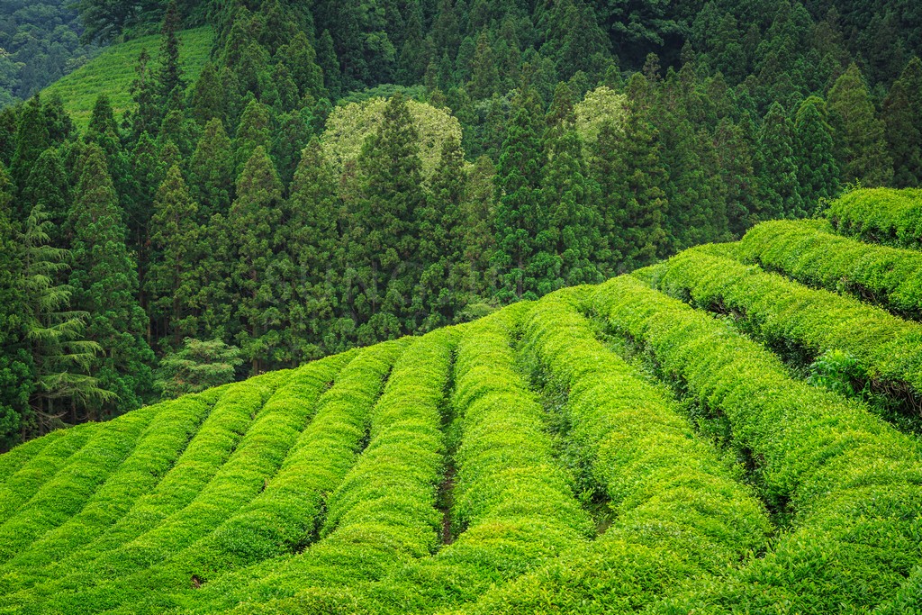 Rows of vibrant green tea bushes cascade down a hillside, creating a textured tapestry of nature's bounty. The soft, diffused light enhances the rich emerald hues of the foliage. A backdrop of dense forest provides a contrasting depth to the scene, emphasizing the cultivated beauty of the tea plantation. The image evokes a sense of tranquility and the meticulous care taken in cultivating these precious leaves.