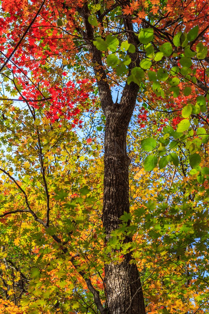This vibrant image captures the breathtaking beauty of autumn foliage. The interplay of fiery reds, oranges, and yellows against a backdrop of green leaves and a clear blue sky creates a stunning visual tapestry. The textured bark of the tree trunk anchors the composition, drawing the viewer's eye upwards through the colorful canopy. The natural light illuminates the leaves, showcasing their intricate details and creating a warm, inviting mood. This photograph celebrates the ephemeral beauty of fall, a time of transformation and vibrant color.