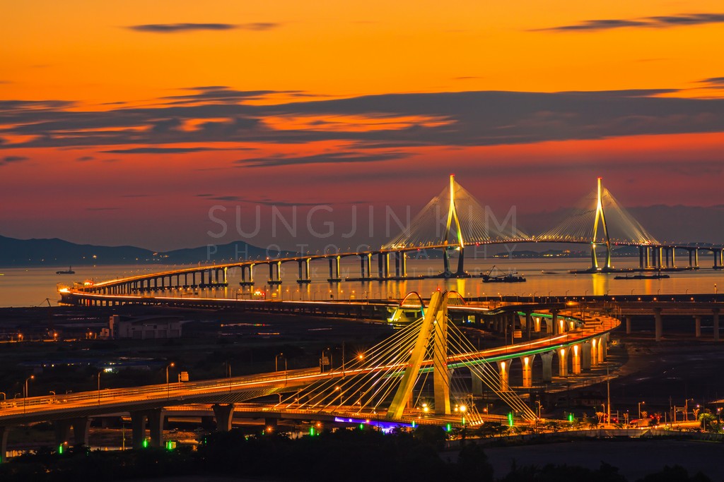 As the sun dips below the horizon, a warm, fiery glow illuminates the sky, casting a dramatic backdrop for a network of illuminated bridges. The elegant lines of the cable-stayed bridges create a striking visual contrast against the soft hues of the twilight sky. The lights tracing the roadways create dynamic leading lines, drawing the viewer's eye across the scene. This photograph captures the beauty of urban infrastructure merging with the natural world in a breathtaking display of light and color.