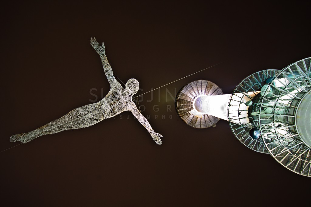 This intriguing nighttime photograph captures a wire mesh sculpture of a man suspended in the air, seemingly reaching towards a brightly lit tower. The dark, almost black background emphasizes the glowing structure and the ethereal figure. The low-angle shot creates a unique perspective, highlighting the intricate details of both the artwork and the tower's architecture.  The contrasting textures of the delicate wire and the solid metal structure add a layer of visual interest.