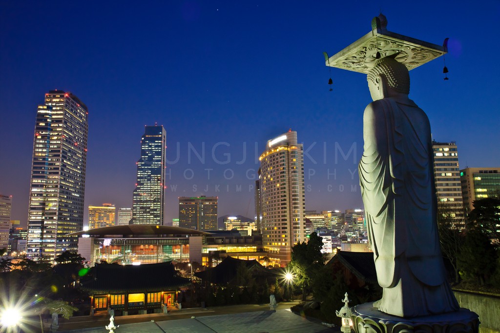 This captivating nightscape juxtaposes the serenity of a Buddhist statue against the vibrant glow of a modern cityscape. The statue, bathed in soft light, stands in quiet contemplation, its back to the bustling metropolis. The warm lights of the buildings create a striking contrast against the deep blue of the twilight sky. The composition creates a sense of peace and contemplation amidst the dynamism of urban life.