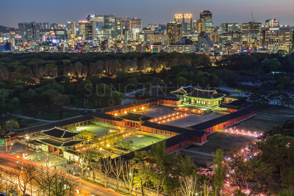 This captivating photograph showcases the serene beauty of Changdeokgung Palace in Seoul, South Korea, as twilight descends. The warm glow of traditional lanterns illuminates the palace courtyard, creating a mesmerizing contrast against the darkening sky and the modern cityscape in the background. The elevated perspective provides a unique view of the palace's intricate architecture and sprawling gardens, highlighting the harmony between nature and human creation. The subtle light trails from passing cars add a touch of dynamism to the scene, while maintaining the overall tranquil atmosphere.