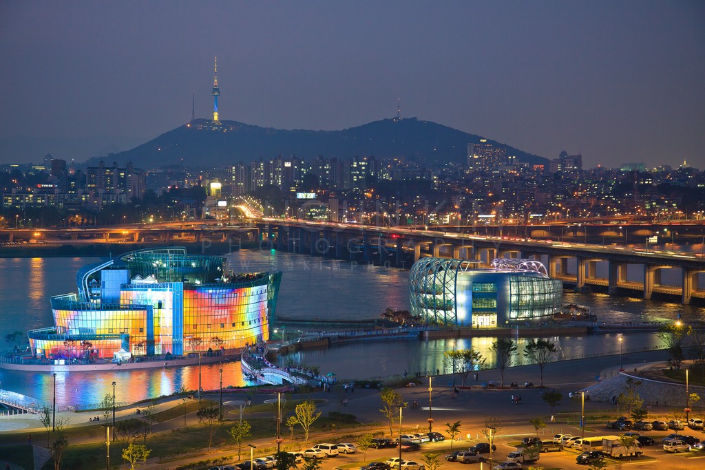This captivating nightscape showcases the vibrant energy of Seoul, South Korea. Two futuristic, illuminated buildings stand on the river, their colorful reflections shimmering in the water. The N Tower, a prominent landmark, rises in the distance against the backdrop of the city's twinkling lights. The bridge, bustling with traffic, adds another layer of dynamism to the composition. The image captures the modern architectural marvels and the vibrant pulse of the city at night.