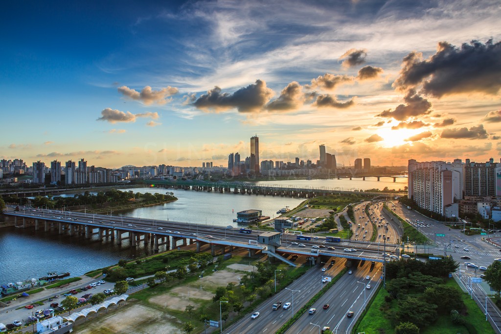 This vibrant cityscape captures the warm glow of sunset over Seoul, South Korea. The Han River winds through the scene, reflecting the colorful sky and highlighting the bridges and bustling traffic.  Modern architecture stands tall against the backdrop of the setting sun, creating a dynamic interplay of urban and natural elements. The image's elevated perspective offers a sweeping view, emphasizing the city's vastness and the beauty of the twilight hour.