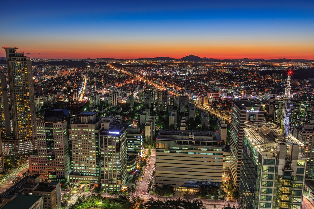 This captivating cityscape photograph captures the vibrant energy of Seoul as twilight descends, bathing the scene in a warm, ethereal glow. The city lights twinkle against the darkening sky, creating a mesmerizing tapestry of urban life. The composition emphasizes the vastness of the metropolis, showcasing its towering buildings and intricate network of streets and lights. The fading light of the setting sun adds a touch of tranquility, contrasting with the bustling activity below.