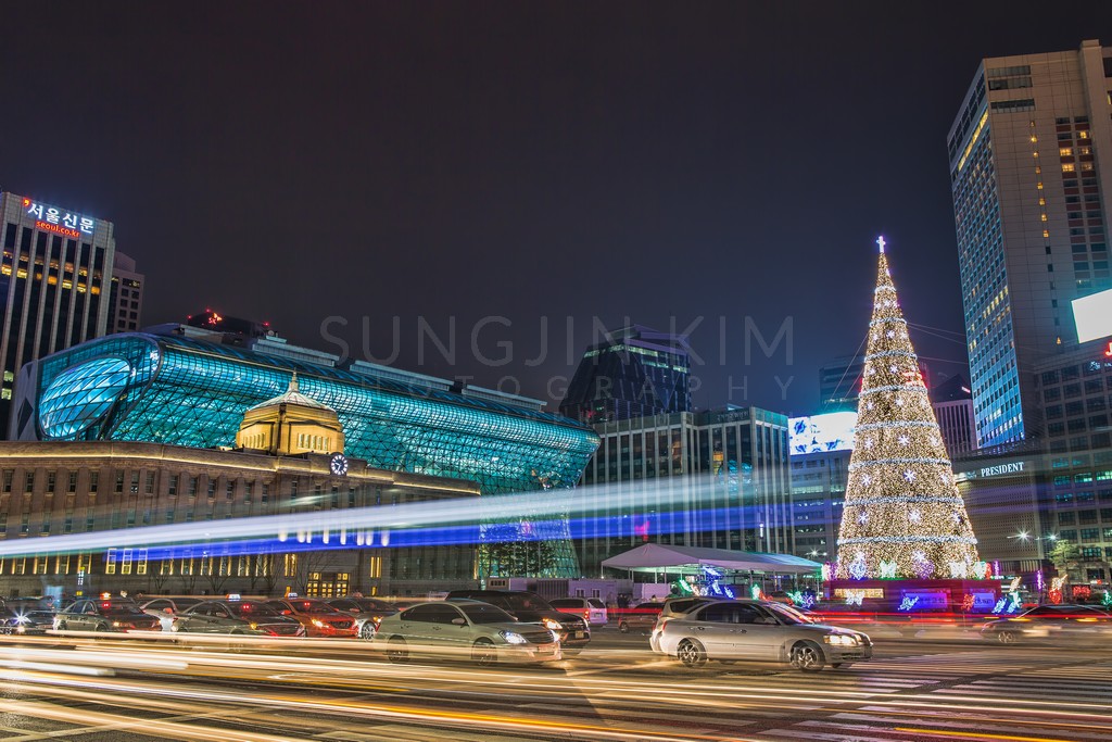 This vibrant night scene captures the festive spirit of Seoul, with a towering Christmas tree illuminating the bustling cityscape. The dynamic composition showcases the city's modern architecture and the energy of the urban environment. Light trails from passing cars create a sense of motion, contrasting with the static brilliance of the Christmas tree and surrounding buildings. The warm glow of the holiday lights adds a touch of magic to the urban landscape.