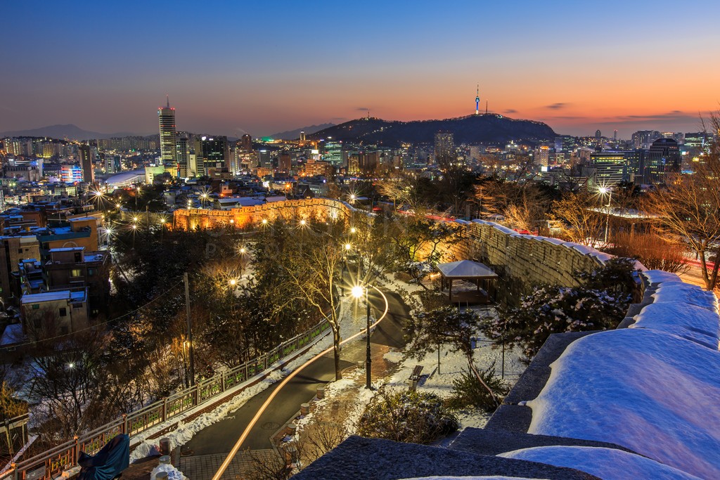 This captivating cityscape photograph captures the magic of twilight descending upon a snow-dusted Seoul. The warm glow of city lights contrasts beautifully with the cool hues of the fading sky, creating a vibrant and dynamic scene. The ancient fortress wall winds through the frame, leading the viewer's eye through the layered composition. The light trails add a sense of movement, while the Namsan Tower stands tall in the background, a beacon in the urban landscape. This image perfectly blends historical elements with modern architecture in a serene winter setting.