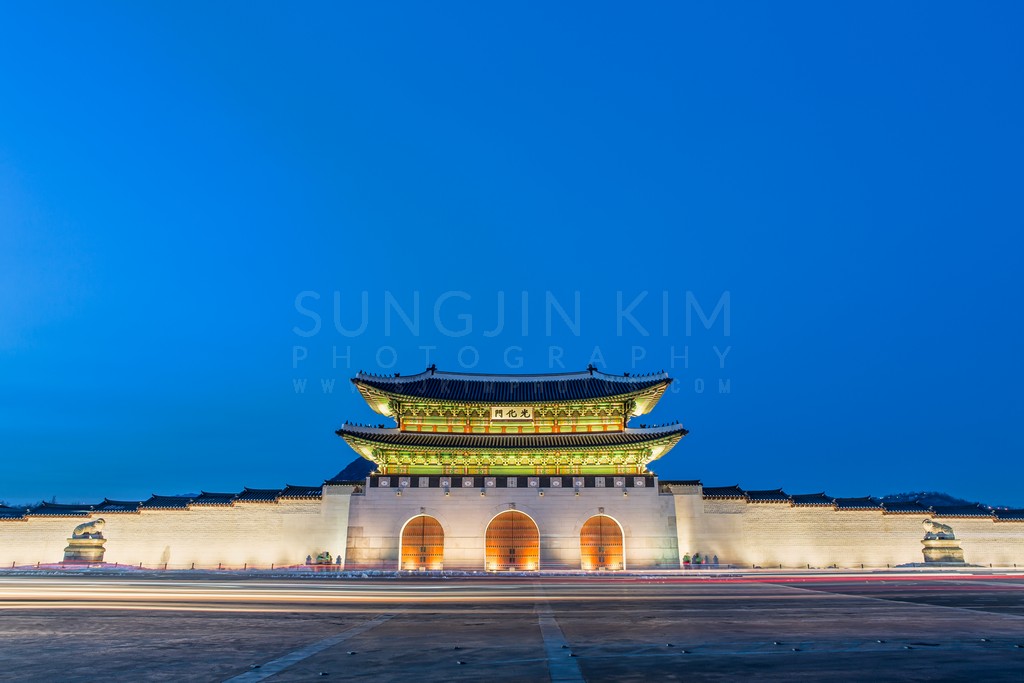 This photograph captures the serene beauty of a traditional Korean gate, bathed in the soft glow of twilight. The vibrant colors of the gate's architecture stand out against the deepening blue sky, creating a striking contrast. The long exposure captures the movement of passing traffic, adding a dynamic element to the otherwise tranquil scene. The composition emphasizes the gate's grandeur and its historical significance. The image evokes a sense of peace and wonder, inviting viewers to explore the rich cultural heritage of Korea.