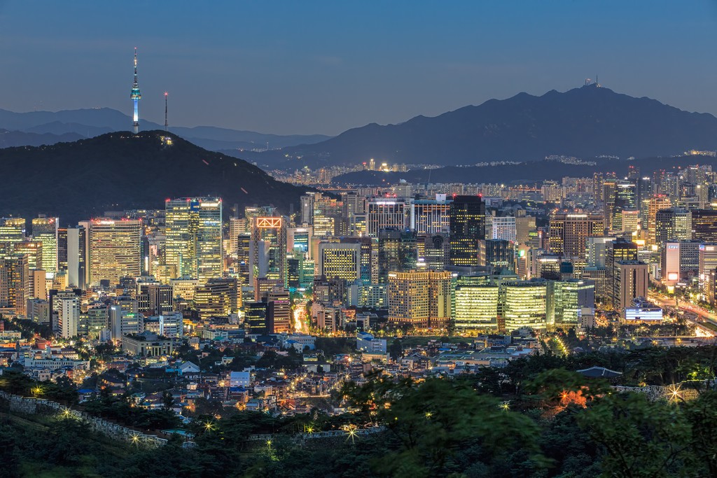 This captivating cityscape photograph captures the vibrant energy of Seoul as twilight descends. The warm glow of city lights contrasts beautifully with the deep blue of the evening sky, creating a dynamic and visually compelling image. The N Seoul Tower stands prominently on the distant mountain, a beacon amidst the urban sprawl. The composition highlights the density of the city, gradually transitioning to the tranquility of the forested hillside in the foreground. The overall mood is one of urban beauty and the quiet transition between day and night.