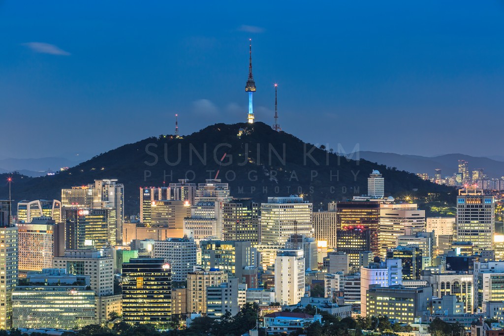This captivating cityscape showcases the iconic N Seoul Tower perched atop Namsan Mountain, its illuminated presence a beacon against the darkening twilight sky. The dense urban landscape of Seoul stretches out below, a tapestry of light and shadow created by the city's vibrant architecture. The cool blue tones of the sky contrast beautifully with the warm glow emanating from the buildings, creating a dynamic and mesmerizing scene. The composition emphasizes the scale of the metropolis, capturing the energy and dynamism of this bustling Asian capital.