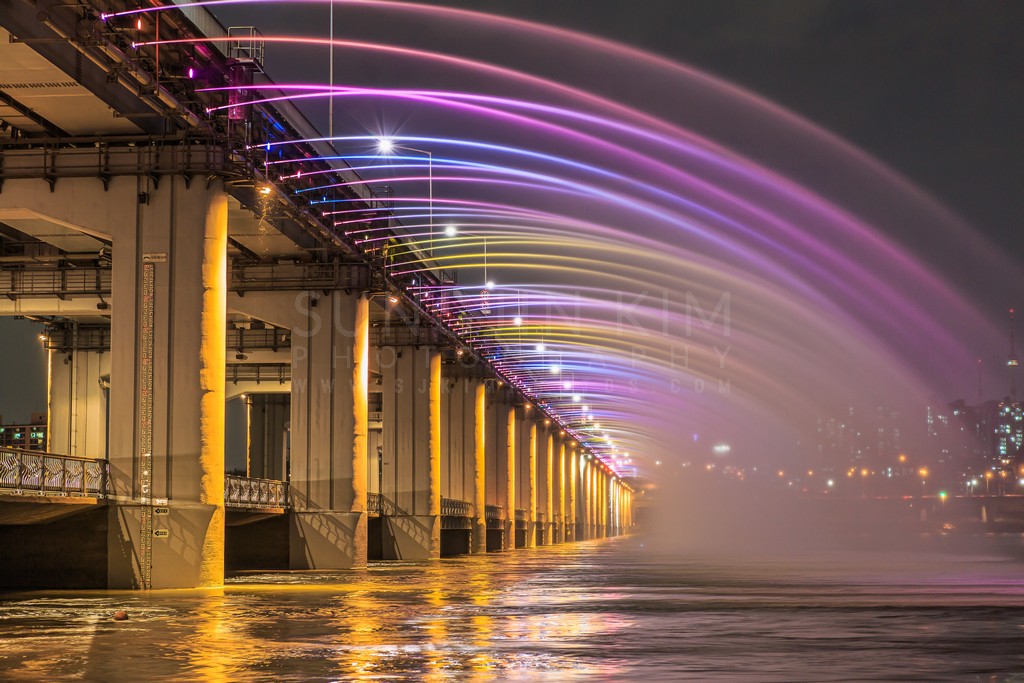 This captivating photograph showcases a bridge illuminated by vibrant, rainbow-colored arcs of light against the backdrop of a night sky. The long exposure captures the flowing movement of the light and water, creating a dreamy, ethereal atmosphere. The warm glow reflecting on the water's surface adds depth and contrast to the scene. The composition emphasizes the architectural lines of the bridge and the dynamic curve of the light display, creating a visually striking image.