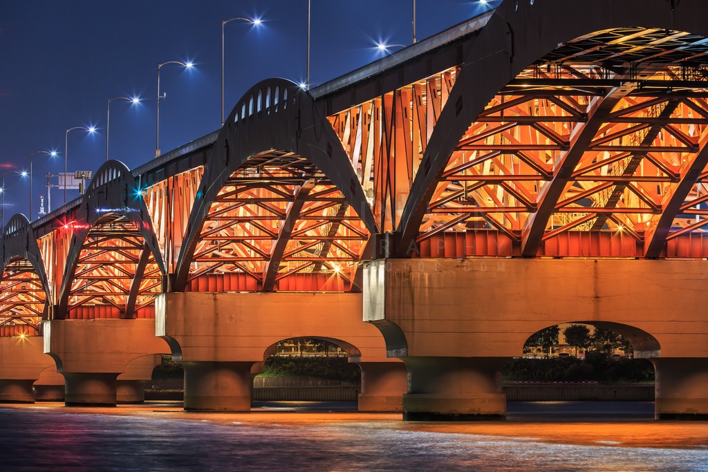This photograph showcases the intricate steelwork of a bridge bathed in the warm glow of artificial light against the twilight sky. The strong lines and geometric patterns of the bridge's structure create a captivating visual rhythm. The interplay of light and shadow emphasizes the architectural details and adds depth to the composition. The calm water below reflects the bridge's lights, enhancing the overall mood of urban tranquility. The image balances the industrial feel of the bridge with a serene, almost ethereal quality.