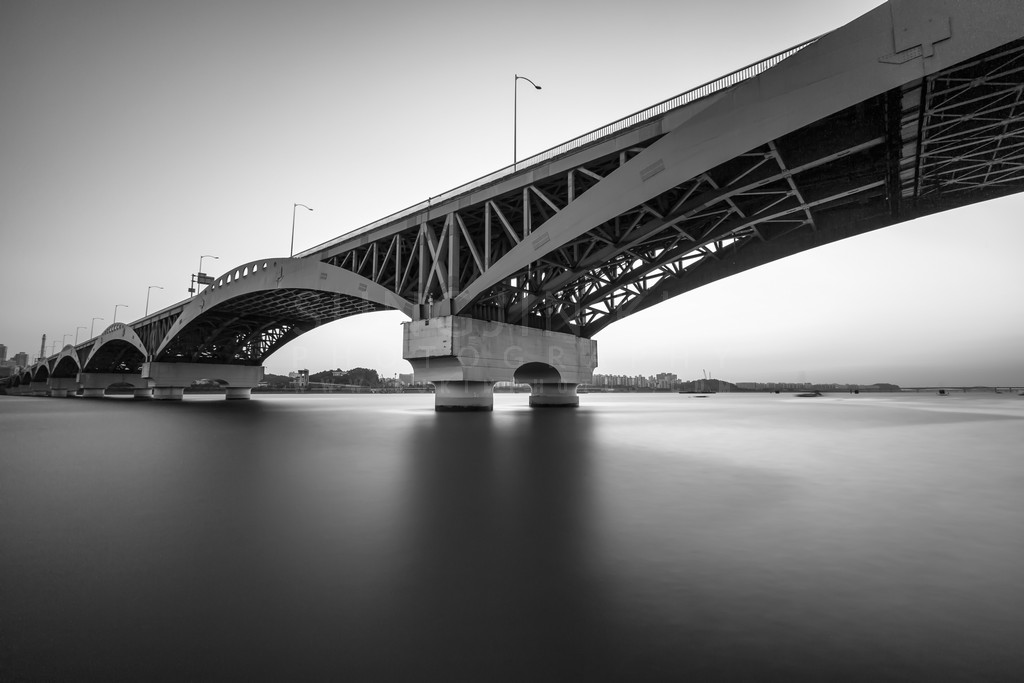 This monochromatic image captures the elegant architecture of a bridge stretching across a serene body of water.  A long exposure smooths the water's surface, creating a dreamlike effect that contrasts with the solid, structural presence of the bridge. The subtle gradations of light and shadow emphasize the bridge's form and create a sense of depth. The minimalist composition and stark black and white palette evoke a mood of quiet contemplation.  The image showcases the beauty of both man-made and natural elements in harmony.