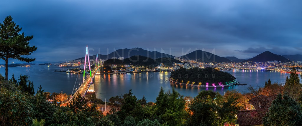 This panoramic view captures a tranquil harbor at twilight, where a modern cable-stayed bridge connects the mainland to a bustling cityscape. The city lights shimmer and reflect on the calm water, creating a mesmerizing interplay of colors and textures.  The darkening sky provides a dramatic backdrop, emphasizing the vibrancy of the urban landscape. The composition, incorporating foreground foliage and the sweeping curve of the bay,  provides a sense of depth and scale.