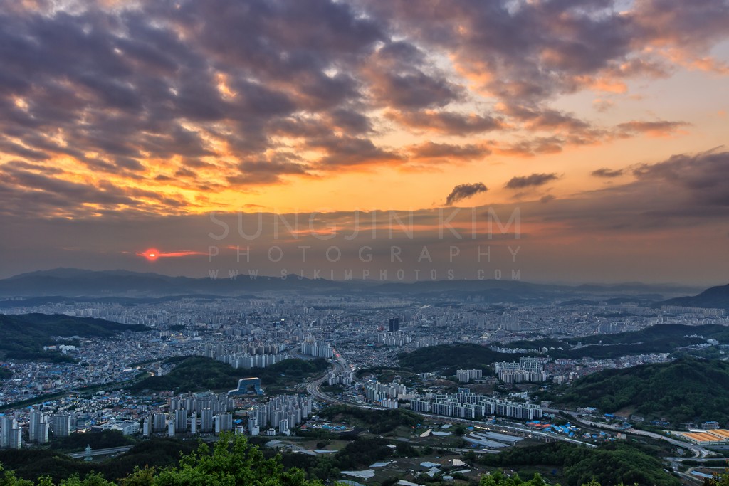 A vibrant sunset paints the sky in hues of orange and purple above a sprawling cityscape. The fading light casts long shadows, revealing the intricate details of the urban landscape below. The dramatic clouds add depth and texture to the scene, creating a striking contrast between the natural and the man-made. The vast expanse of the city, nestled amongst rolling hills, showcases the dynamic interplay between human development and the surrounding environment. This image captures the beauty of a city at dusk, bathed in the warm glow of a spectacular sunset.