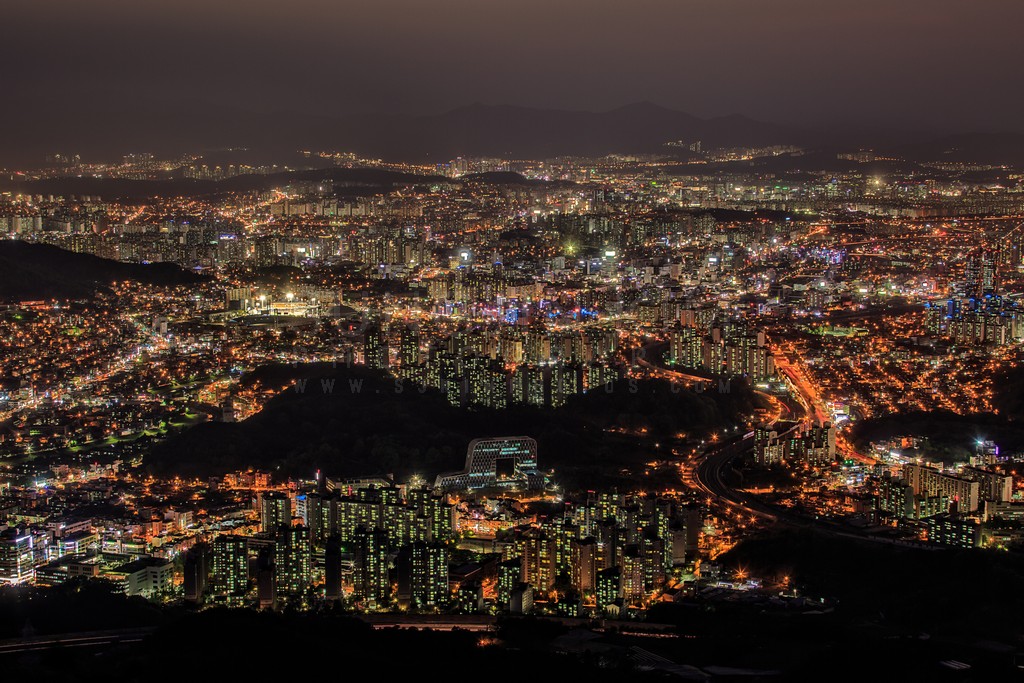 This captivating nightscape showcases the sprawling urban expanse, illuminated by a myriad of lights. The intricate network of roads and buildings creates a mesmerizing tapestry of urban life. The varied colors and intensities of the lights add depth and dimension to the scene, while the darkened hills and mountains in the distance provide a striking contrast. The image captures the vibrant energy and dynamic atmosphere of a city that never sleeps.