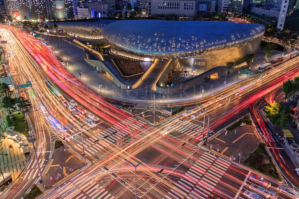 This vibrant cityscape photograph captures the energetic flow of traffic at night, with light trails painting dynamic lines across the urban canvas. The futuristic architecture of the Dongdaemun Design Plaza (DDP) anchors the scene, its illuminated facade providing a striking contrast to the blurred motion of vehicles. From a high vantage point, the composition emphasizes the intricate network of roads and crosswalks, creating a sense of organized chaos. The long exposure technique transforms ordinary city lights into streaks of color, giving the image a mesmerizing, almost abstract quality.