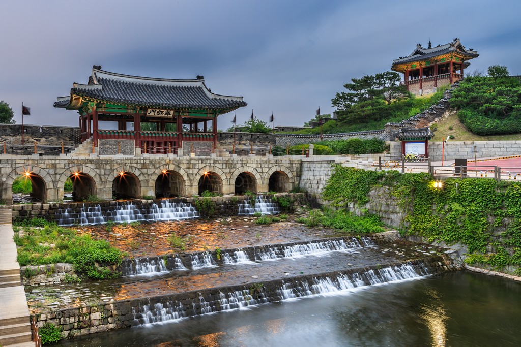 A serene twilight scene showcases the Hwaseong Fortress gate, its traditional architecture standing in quiet contrast to the dynamic flow of water beneath. The cascading stream, captured with a long exposure, creates a smooth, ethereal effect, reflecting the soft light from within the gate's arches. The image balances architectural details with the natural beauty of the flowing water, presenting a tranquil yet compelling composition. The muted colors of the dusk sky further enhance the peaceful atmosphere.