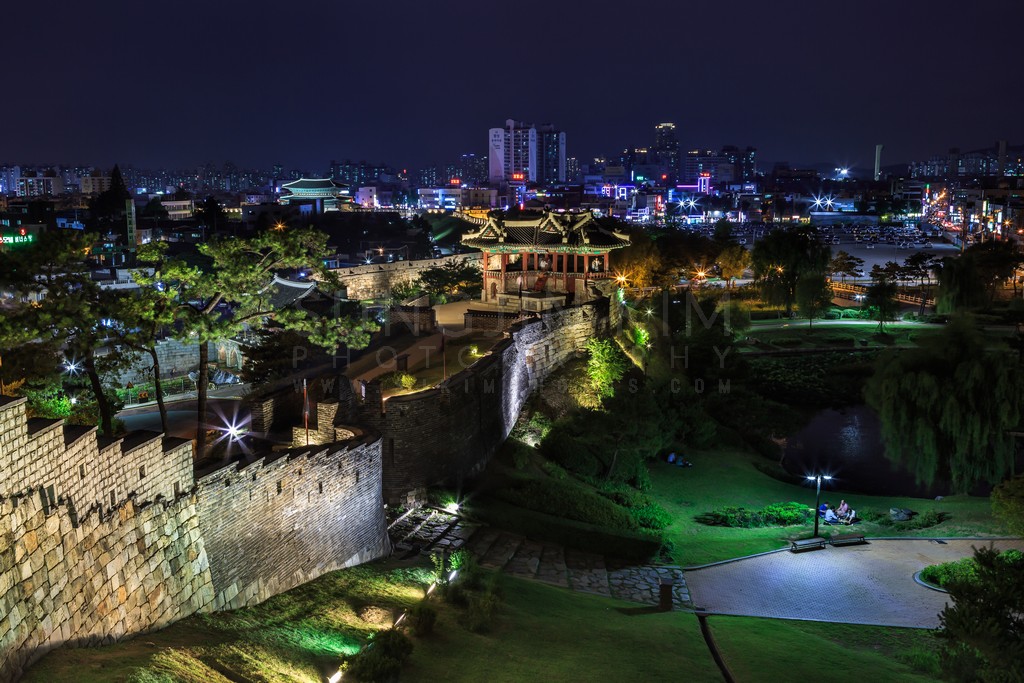 This captivating night photograph showcases the illuminated walls of a historic fortress, juxtaposed against the backdrop of a modern city skyline. The warm glow of artificial lights accentuates the ancient stonework, creating a striking contrast with the cool, dark night sky. The carefully composed image captures the interplay of light and shadow, highlighting the intricate details of the architecture and the surrounding landscape. The overall mood is one of serenity and timeless beauty, as the ancient structure stands in quiet defiance of the passing centuries.