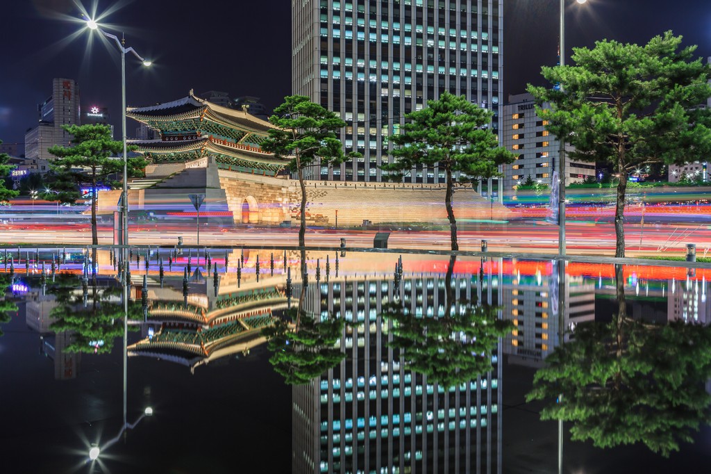 This captivating night photograph juxtaposes Seoul's historical architecture with its contemporary skyline, reflected in a still pool of water. Light trails from passing cars paint vibrant streaks across the scene, contrasting with the static beauty of the ancient gate and surrounding trees. The perfect symmetry of the reflection creates a surreal and mesmerizing effect, showcasing the city's unique blend of past and present. The cool night tones and the warm glow of the city lights create a dynamic and evocative atmosphere.