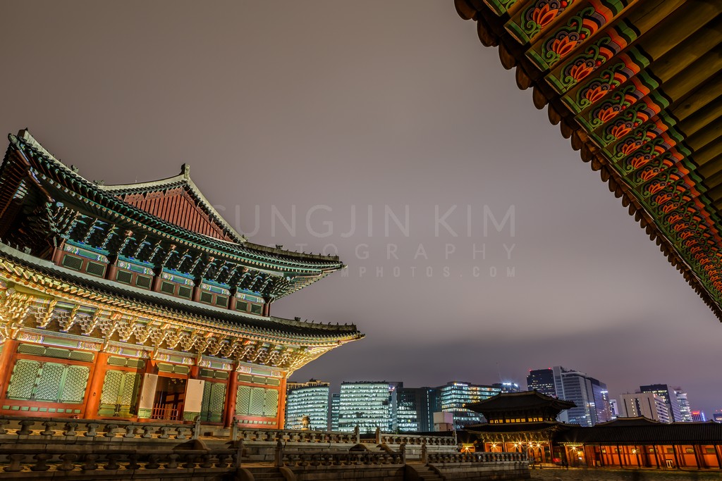 This photograph captures the serene beauty of a traditional Korean palace at night.  Illuminated against a dusky sky, the intricate details of the palace architecture and vibrant painted eaves are highlighted.  The juxtaposition of the historic structure with modern city buildings in the background creates a compelling visual narrative of past and present.  The composition, with a foreground element of a decorated roofline, draws the viewer's eye into the scene and emphasizes the rich cultural heritage.