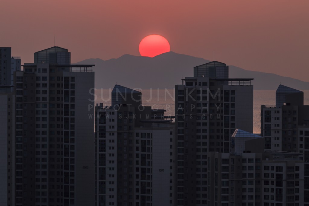 The vibrant crimson sun dips below the horizon, casting a warm glow over the distant mountains and reflecting on the calm waters. Silhouetted against the colorful sky, a cluster of modern high-rise buildings creates a striking urban landscape. The composition emphasizes the contrast between the natural beauty of the sunset and the man-made structures. The mood is serene yet dynamic, capturing the transition from day to night.