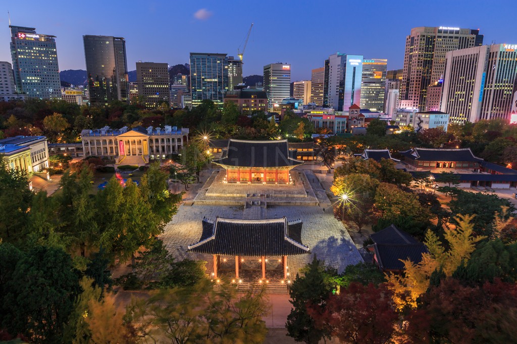This captivating twilight image showcases the serene beauty of a traditional Korean palace nestled within a bustling modern cityscape. The warm glow of the palace lights contrasts beautifully with the cooler tones of the city skyline, creating a compelling juxtaposition of old and new. The elevated perspective offers a unique view of the palace grounds, highlighting the intricate architecture and the colorful autumn foliage. The tranquil atmosphere of the palace grounds provides a sense of peace and history amidst the vibrant energy of the city.