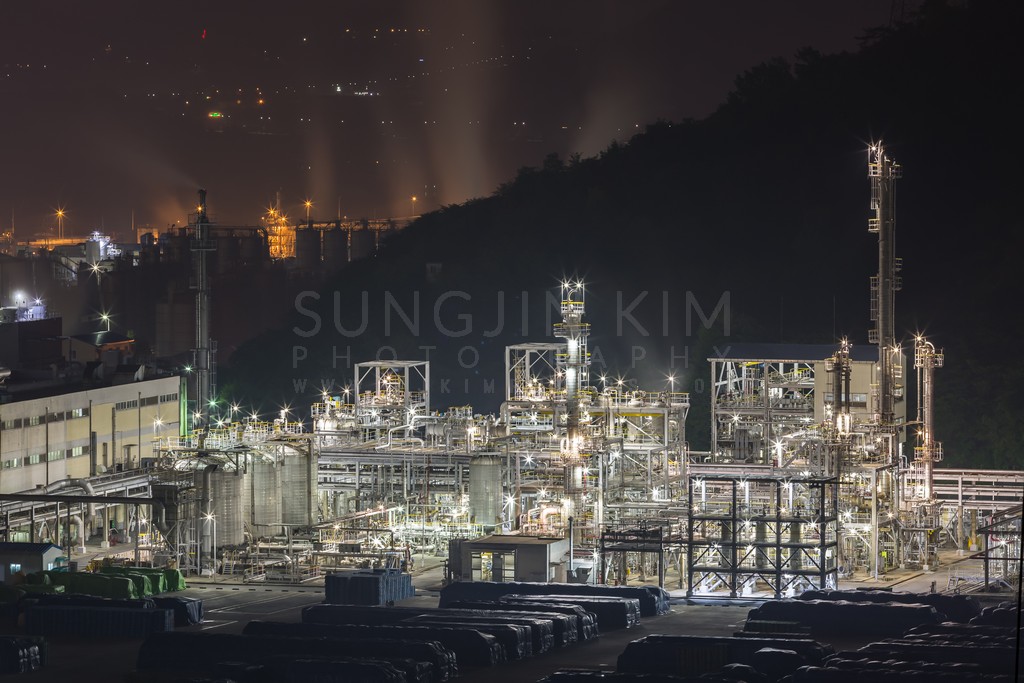 This captivating night photograph showcases the intricate network of pipes, tanks, and structures of an industrial plant. Artificial lights illuminate the scene, casting a warm glow and creating a dramatic contrast against the dark night sky. The complex architecture and geometric patterns of the plant are highlighted, offering a unique perspective on industrial beauty. The image evokes a sense of power and productivity, capturing the vibrant pulse of industry after dark.