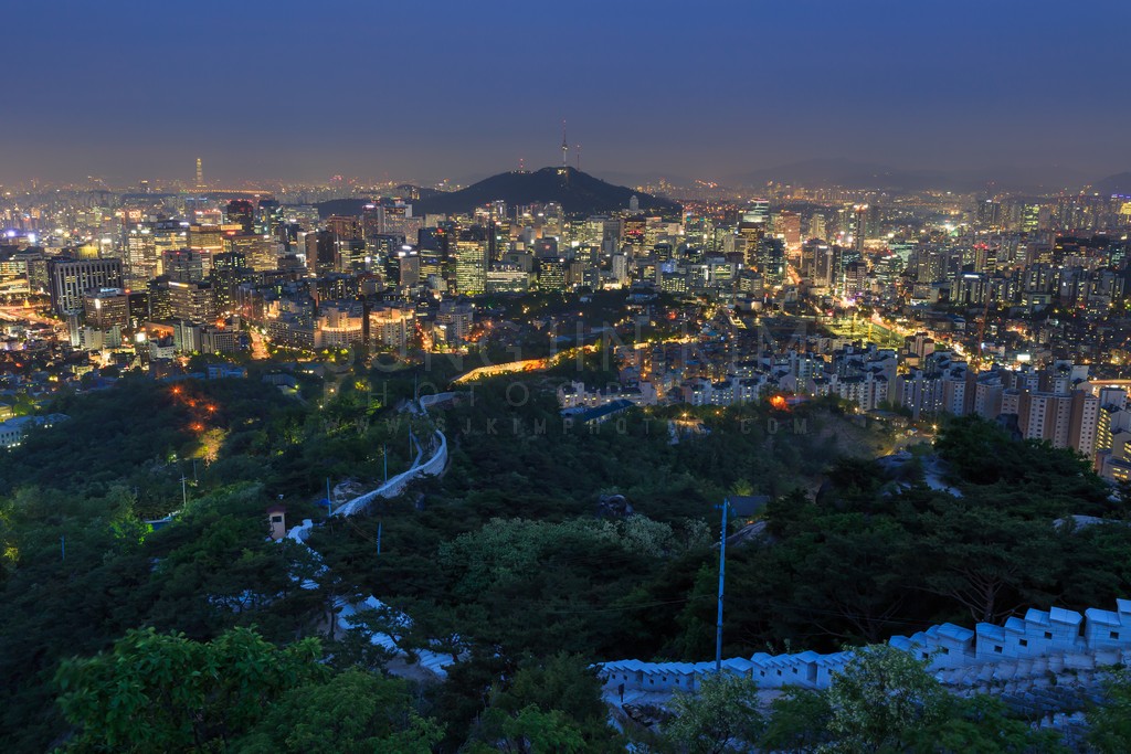 This captivating cityscape photograph captures the vibrant energy of Seoul as twilight descends. The warm glow of city lights contrasts beautifully with the deep blue of the evening sky, creating a dynamic and engaging scene. From a vantage point overlooking a forested hillside and a portion of the city wall, the composition offers a unique perspective of the sprawling urban landscape, punctuated by N Seoul Tower in the distance. The image evokes a sense of awe and wonder, showcasing the beauty of a modern metropolis nestled amongst natural elements.