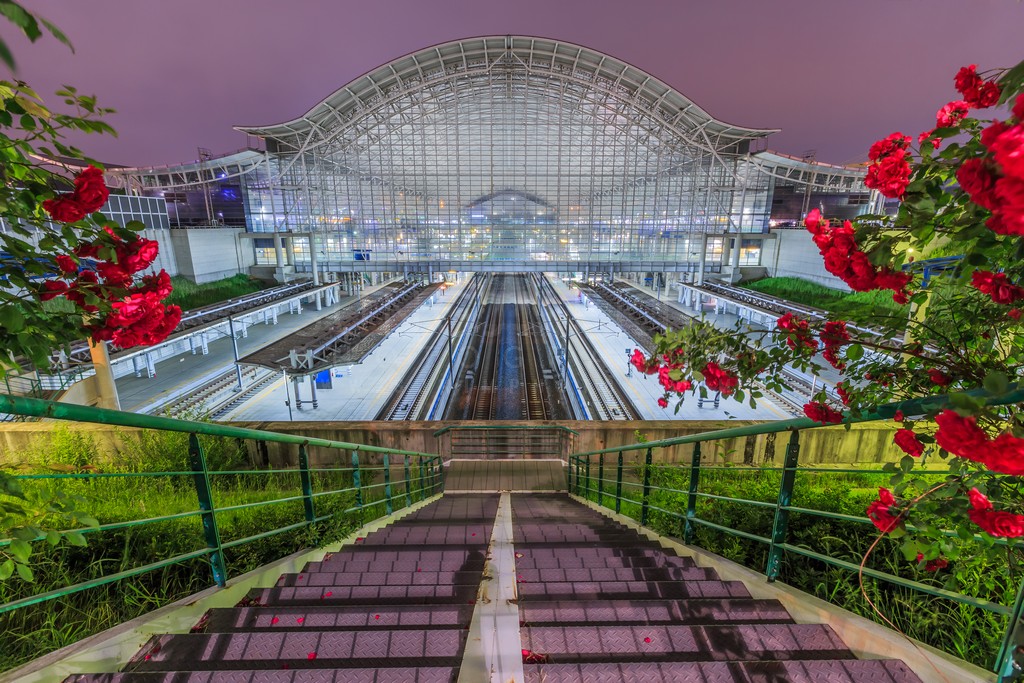 This captivating photograph captures the quiet beauty of a modern train station at twilight. Vibrant red roses frame the composition, leading the viewer's eye down a flight of stairs towards the illuminated glass and steel structure of the station. The cool, artificial lighting contrasts beautifully with the warm hues of the roses, creating a dynamic and evocative scene. The converging lines of the railway tracks draw the viewer deeper into the image, hinting at journeys yet to begin.
