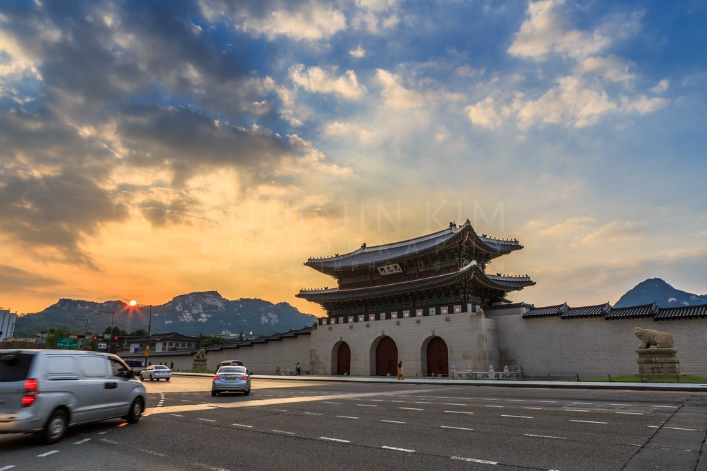 This photograph captures the grandeur of a traditional Korean palace gate, bathed in the warm, ethereal light of the setting sun. The two-tiered gate stands as a focal point, its intricate details highlighted against the vibrant sky and the silhouette of distant mountains. The bustling city life continues in the foreground, creating a juxtaposition between the ancient and the modern. The warm golden hues and dramatic clouds create a sense of serenity and awe, capturing the essence of this historic landmark.