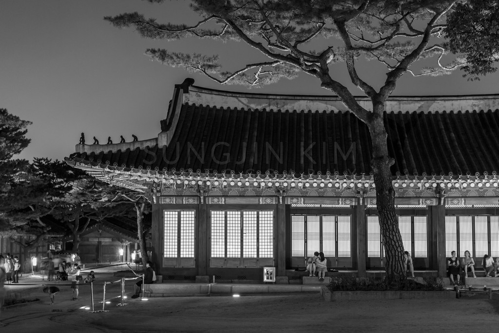 This monochrome image captures the serene atmosphere of a traditional Korean palace at twilight. The intricate details of the architecture are highlighted by the soft glow emanating from within, contrasting with the dark, textured roof tiles and the silhouettes of the decorative figures perched atop. A gnarled pine tree frames the scene, adding a touch of natural beauty to the man-made structure. Visitors quietly rest and converse on the steps, adding a sense of human connection to the timeless scene. The overall mood is peaceful and contemplative, inviting the viewer to experience the tranquility of this historical place.