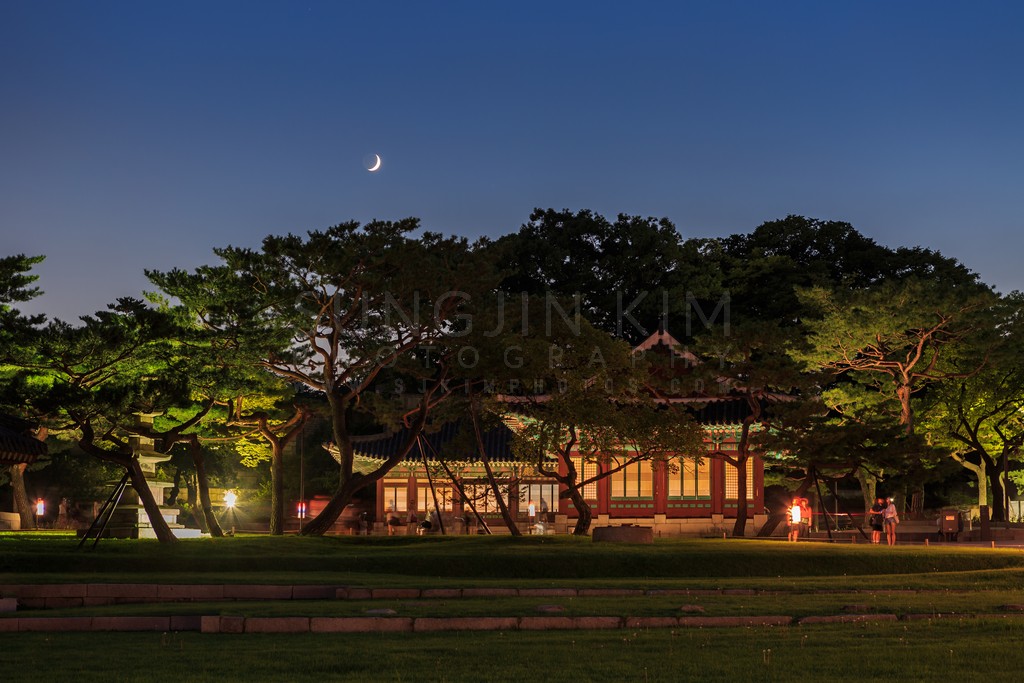 A serene twilight scene captures a traditional Korean palace nestled amongst illuminated trees and lush green lawns. The warm glow from within the palace contrasts beautifully with the deep blue of the evening sky, punctuated by a delicate crescent moon. The scene evokes a sense of quiet contemplation and cultural richness. The careful composition and balanced lighting enhance the tranquil atmosphere of this captivating image.