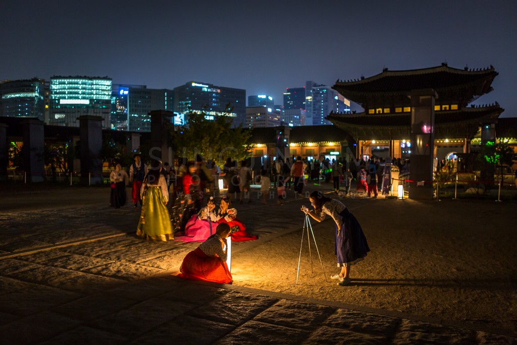 This captivating night scene showcases the rich traditions and vibrant atmosphere of a cultural gathering. Women in colorful hanboks, traditional Korean attire, create a striking visual contrast against the backdrop of a historic building and modern cityscape. Warm artificial lighting illuminates the scene, casting a soft glow on the figures and creating a sense of celebration. The image beautifully blends the old and the new, capturing a moment of cultural pride and artistic expression.