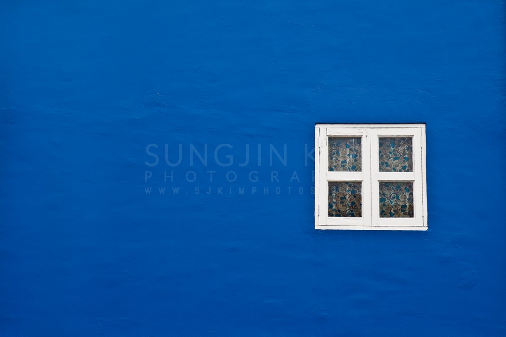 This minimalist photograph features a vibrant cobalt blue wall punctuated by a small, white-framed window. The window's patterned curtain offers a subtle textural contrast against the smooth expanse of the wall. The composition emphasizes the interplay of color and form, creating a sense of quiet contemplation. The bright blue evokes a sense of calm and peace, while the window hints at a hidden interior world.