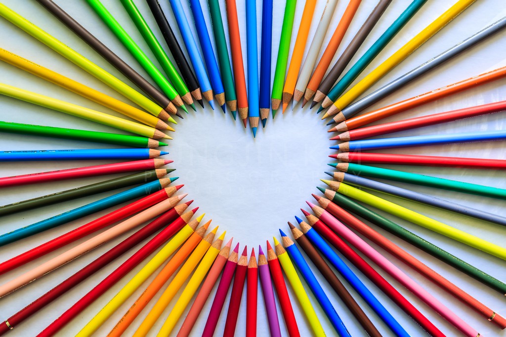 A vibrant array of colored pencils form a heart shape against a clean white backdrop. The radial composition draws the eye to the center, showcasing the spectrum of hues and the texture of the wooden pencils. Soft, diffused lighting enhances the colors and creates a cheerful, playful mood. This image is a celebration of creativity and the tools that bring artistic visions to life.