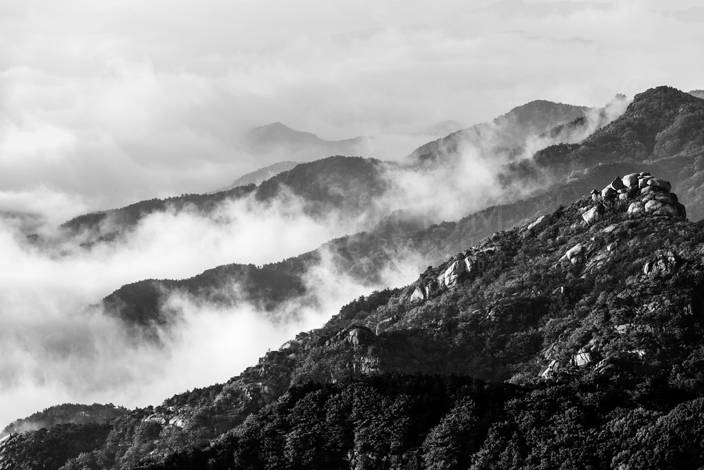 This black and white photograph showcases a series of mountain ranges with low-lying clouds drifting among the peaks. The high contrast emphasizes the rugged terrain and the softness of the mist.
