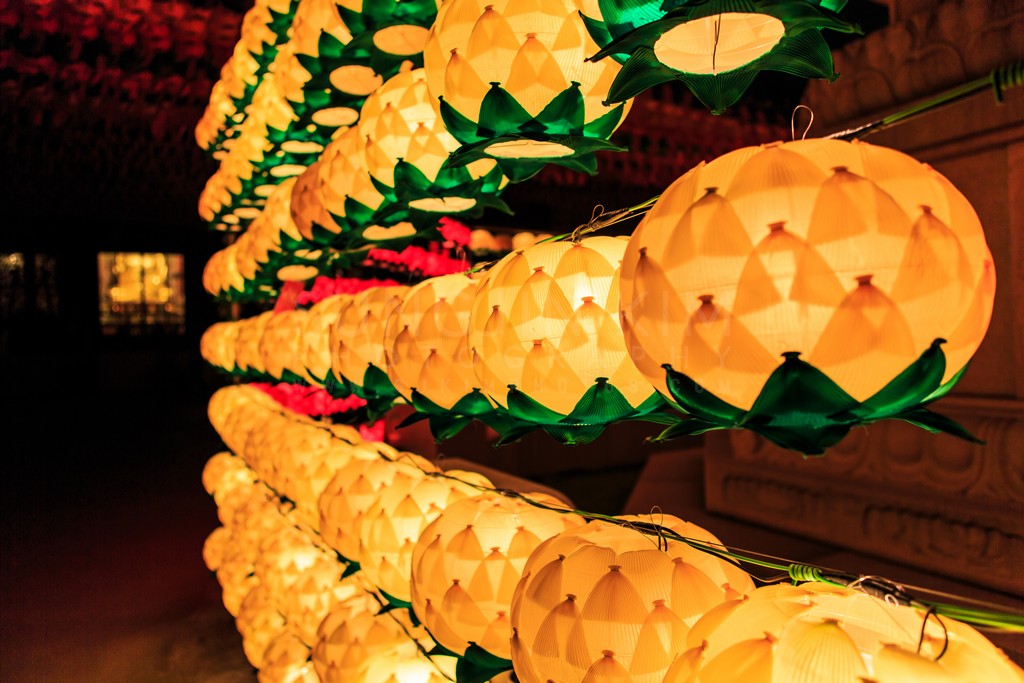 Rows of intricately crafted lotus lanterns create a mesmerizing display, their warm golden light illuminating the surrounding darkness. The delicate paper petals and green leaf accents add a touch of elegance and tranquility to the scene. The soft glow emanating from within each lantern casts intriguing shadows and highlights the subtle textures of the materials. This photograph captures the beauty and serenity of these traditional lights.