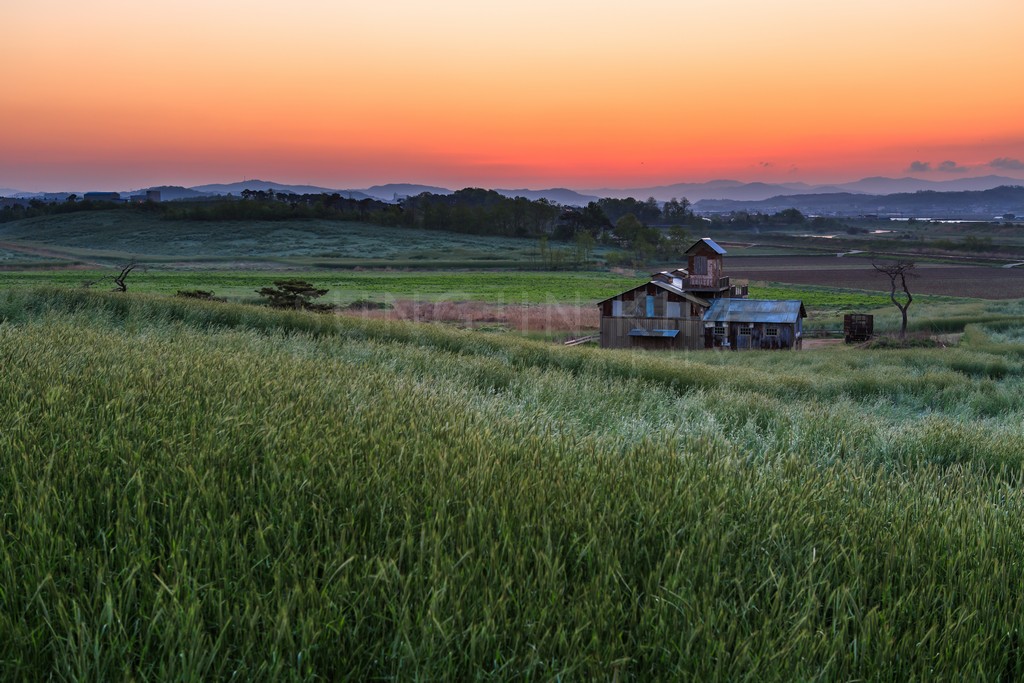 Calm and serene is this vista. Tall grasses and a colourful sky is the backdrop, and an old rural house looks on from the horizon.