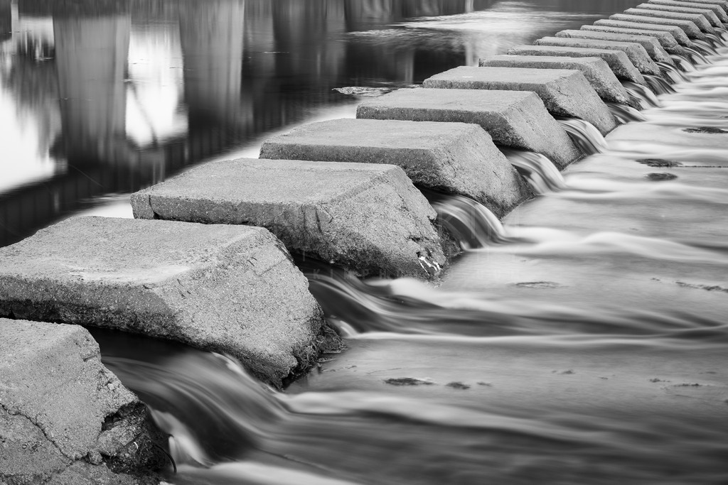 This monochrome image captures the smooth flow of water over a series of concrete steps. The long exposure creates a silky effect, emphasizing the movement of the water as it cascades down. The stark contrast between the textured concrete and the ethereal water adds a compelling visual dynamic. The reflection of a bridge structure in the upper part of the frame adds a layer of depth and interest to the composition. The overall mood is serene yet powerful, showcasing the beauty of simple forms and the transformative power of long exposure photography.