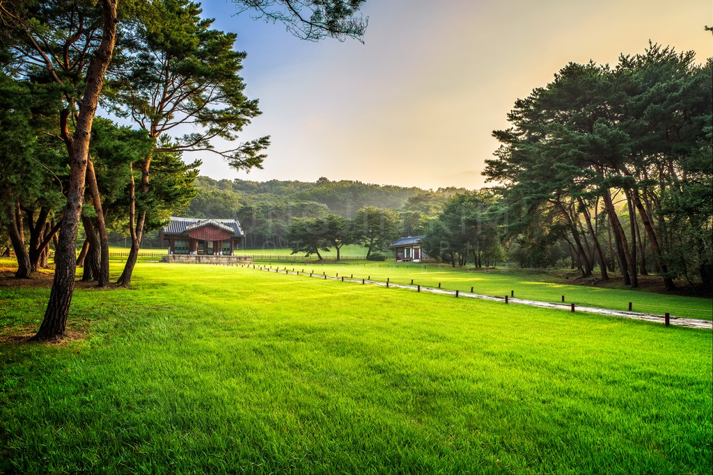 This image captures a peaceful scene in a traditional Korean setting, showcasing lush green grass, tall pine trees, and a beautifully crafted building in the distance. The soft morning light enhances the serene atmosphere, while a gentle path guides the eye through the landscape. This photograph invites viewers to experience the calm and beauty of Korean culture and nature.
