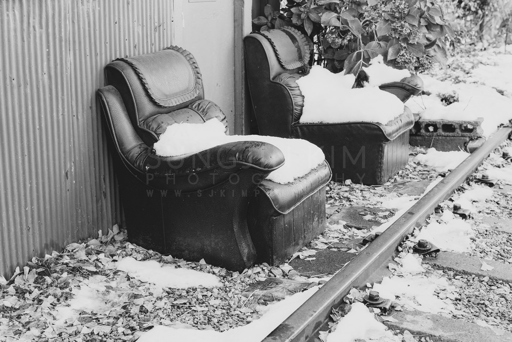 Two worn leather armchairs sit dusted with snow beside a railway track, evoking a sense of quiet abandonment and forgotten comfort. Captured in monochrome, the image emphasizes the texture of the leather and the contrast between the man-made objects and the natural elements of snow and dried leaves. The composition leads the eye along the track, hinting at journeys past and future, while the overall mood is one of serene melancholy. The soft diffused light contributes to the nostalgic feel of the scene.