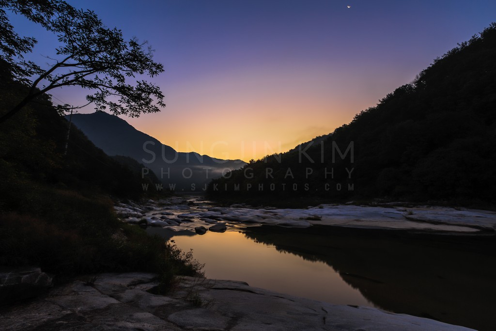 Captured in the soft light of twilight, this tranquil scene features a river flowing through a mountainous landscape. Silhouetted hills frame the horizon, while a gentle glow paints the sky in hues of orange and purple. The calm water reflects the sky and the surrounding rocks and trees, creating a serene and peaceful atmosphere. A crescent moon adds a touch of magic to the scene.